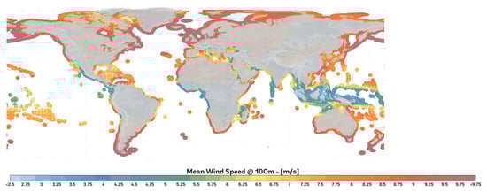Another crucial factor to consider is the availability of sufficient wind resources, which determines the feasibility of offshore wind projects. Figure 4 shows the mean wind speeds along the coastlines of the world, with higher speeds generally indicating more favorable wind resources. Additionally, it is essential to consider the local mean wind power density, which indicates the available wind resources at a specific location [89,90].