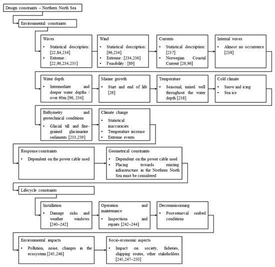 The design of oil and gas (O&G) industry risers and mooring systems has been performed together numerous times [13]. Ja’e et al. [14] provided an overview of such studied and implemented systems. The combined consideration is crucial for the functionality and safety of riser systems, as damage can have fatal repercussions. Similarly, the safety levels for offloading lines must be high to prevent severe incidents. Mooring systems and power cables are not as closely reliant on each other in offshore wind farms as mooring systems and O&G lines containing highly flammable fluids. That is because damaged power cables have fewer consequences on human lives and the marine environment than a damaged riser or an offloading line can have. Even though this means that lower safety levels may be applied to power cables [15], they are nevertheless a crucial part of the functionality of offshore wind farms. A damaged power cable disrupts the connection between the electrical energy-generating wind turbine and the consumer, resulting in zero revenue and possibly high repair costs for the wind farm owner and operator.