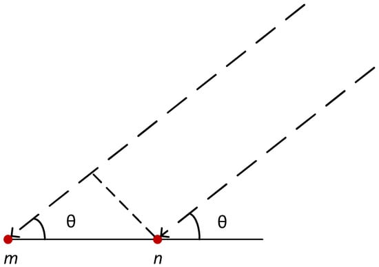 The vector projection method is a direction-finding algorithm for two-element arrays operating under far-field plane-wave conditions. Figure 2 demonstrates a typical two-element direction finding system, where the key parameter is the incident angle θ between the signal propagation direction and the array baseline, with θ ranging from 0° to 180°. The fundamental relationship between this angular parameter and the phase differences observed between transducer elements is mathematically expressed in Equation (1). This formulation establishes the theoretical foundation for converting phase measurements into spatial orientation information, enabling precise directional estimation through systematic analysis of acoustic signal characteristics.