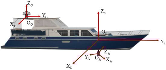 In this study, the transformation between three coordinate systems is considered: the acoustic coordinate system, the vessel-mounted coordinate system, and the geodetic coordinate system. As shown in Figure 3, assuming that the coordinate systems of the SINS and USBL are aligned, the acoustic coordinate system is represented as the A-frame, where the origin OA is located at the center of the array. The XA-axis is aligned with the direction of the first array element, the YA-axis is oriented vertically upward from the array plane, and the XA-axis, YA-axis and ZA-axis form a left-handed coordinate system. The vessel-mounted coordinate system is denoted as the S-frame, with its origin coinciding with that of the acoustic coordinate system. In this system, the XS-axis points eastward, the YS-axis points northward, and the ZS-axis is directed vertically upward from the XSOsYS plane. The geodetic coordinate system is represented as the G-frame, with its origin located at the center of the DGPS antenna. In this system, the XG-axis points eastward, the YG-axis points northward, and the ZG-axis is oriented vertically upward from the XGOGYG plane.