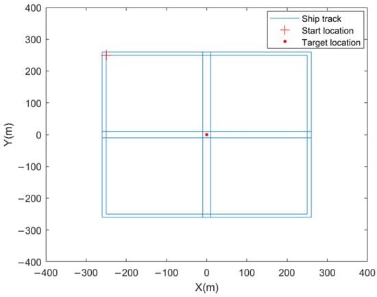 During calibration procedures, the transponder is submerged at a known position. The SINS/USBL equipment, rigidly mounted underwater, incorporates high-precision RTK positioning. The survey vessel carrying the USBL system maneuvers around the transponder. At each trajectory position, the acoustic array communicates with the transponder while recording the following three data streams: RTK-derived vessel coordinates, SINS-calculated attitude parameters, and USBL-acquired hydroacoustic measurements. Figure 7 simulates this calibration geometry, with the transponder fixed at coordinates (0, 0, −200). The USBL array configuration follows the uniform five-element circular geometry shown in Figure 1, featuring a 16.25 cm array radius. Data acquisition occurs at 0.1 s intervals over a 729.1 s operational period. The SNR is set to 0 dB.