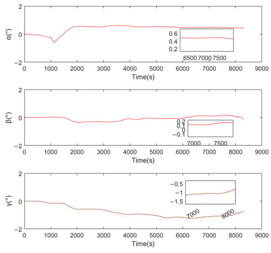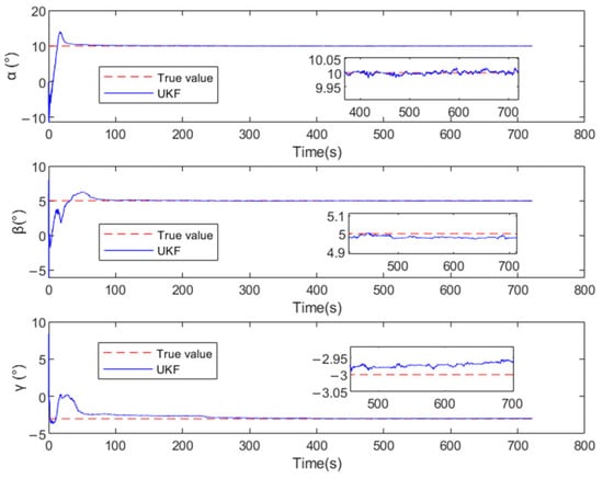 The observation equation exhibits inherent nonlinearity. A conventional approach for handling nonlinear problems is the Gauss–Newton method (GNM), which linearizes the system through Taylor series expansion, enabling parameter updates via linear least-squares solutions at each iteration. However, the Jacobian matrix derived from Equation (18) demonstrates significant complexity. The iterative nature of GNM requires repeated linear approximations using local Taylor expansions around current parameter estimates, followed by linear least-squares optimization until convergence or maximum iterations are reached—a process incurring substantial computational overhead. To improve both estimation accuracy and computational efficiency, this study employs the UKF for installation errors estimation, eliminating the need for explicit Jacobian calculations while maintaining recursive estimation capabilities.