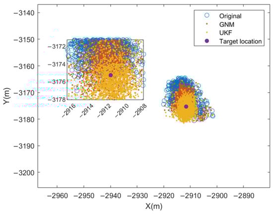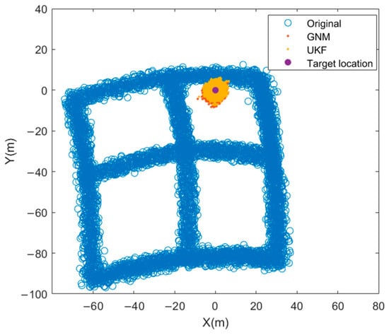 As shown in Figure 8 and Figure 9, the UKF estimation results demonstrate convergence after 600 s, with all error estimates maintaining errors within 0.05° of true values. Consequently, the mean values from 600 s to 700 s are adopted as final error estimates. For performance comparison, the same data segment is processed using GNM with 400 iterations, where the last iteration output serves as GNM’s estimate. Table 2 presents both algorithms’ estimation errors against ground truth values. For installation angle errors, UKF achieves errors of 0.0037°, −0.0116°, and 0.0296°, while GNM yields 0.0113°, 0.0211°, and −0.0271°. Regarding inter-element phase errors, UKF exhibits errors of −0.0074°, 0.0101°, 0.0083°, −0.0096°, and −0.0068°, compared to GNM’s 0.0149°, 0.0303°, −0.0115°, −0.0174°, and 0.0178°. These results quantitatively confirm UKF’s superior estimation accuracy over GNM. Figure 10 shows the influence of the errors estimated by UKF and GNM on the final positioning results. It can be seen that both algorithms can calibrate and converge the positioning results near the target position, demonstrating the effectiveness of the calibration model. Table 3 analyzes the positioning errors in each direction. It can be seen that the positioning results obtained by using the estimated parameters of UKF have higher accuracy.