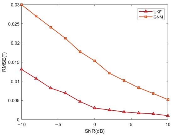 In order to verify the parameter estimation performance of UKF and GNM under different SNR, a simulation experiment was established and the SNR range was set from −10 dB to 10 dB. The vessel trajectory is shown in Figure 7. Since the simulation experiment is solely focused on investigating the influence of the SNR on the estimation accuracy, the error angles are set identically to those in the previous context. The number of Monte Carlo experiments is set to 1000, and the final error result is the RMSE. For the sake of convenience, only the relationship between the error angle and the SNR is observed. The result is shown in Figure 11.