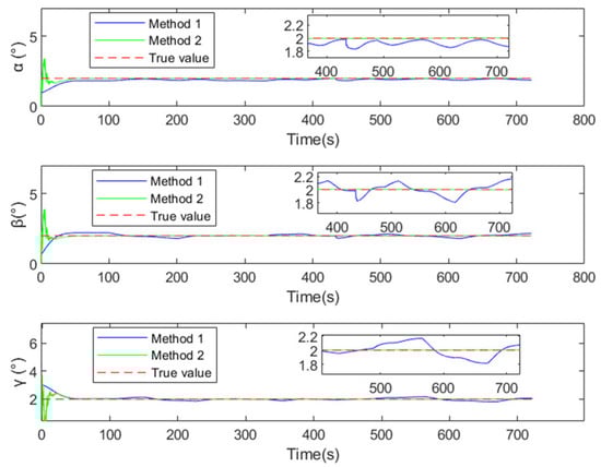 To validate the calibration algorithm’s immunity to array geometry errors (applicable to arbitrary configurations), the array was reconfigured into a quadrilateral orthogonal layout with each element positioned 0.1625 m from the origin. Element 4 was intentionally displaced 0.01 m along the y-axis, as illustrated in Figure 12. Set the installation Angle errors as . With preset phase errors intentionally excluded, this configuration specifically evaluates array displacement impacts on installation angular errors estimation. Method 1 represents the conventional calibration model, while Method 2 denotes the proposed model, both employing UKF for errors estimation.