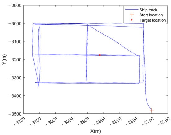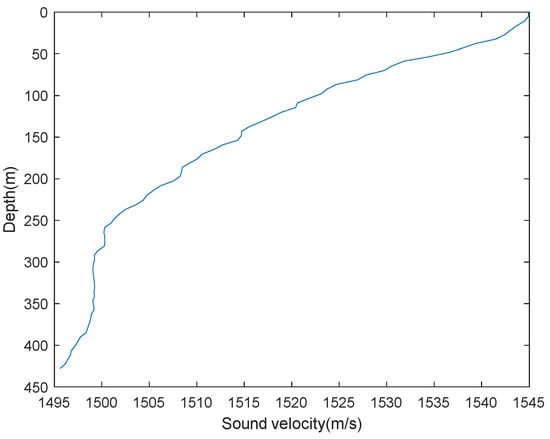 During the experiment, the USBL system was installed on the starboard side of the ship’s bow. To facilitate observation and analysis of the results, a fixed point was selected as the origin of the coordinate system, with geographic coordinates of 109.970522° longitude and 17.257211° latitude. In this established coordinate system, the positive north direction is defined as the Y-axis, and the positive east direction as the X-axis. The target was placed on the seabed, with its specific location determined through long-baseline intersection algorithms. During the system calibration phase, the position of the target was considered known; in this experiment, the target’s coordinates were (2911.58, −3175.29, −416). Figure 15 illustrates the relative positions and trajectories of the vessel and the target during the calibration process. In order to make the calibration results more accurate, the error of sound velocity needs to be corrected. The Sound velocity profile diagram is shown in Figure 16. The sound velocity correction method is used to analyze the sound velocity profile through the Bellhop software v2024, establish the relationship graph between the effective sound velocity and the horizontal distance, and replace the sound velocity of each point with the effective sound velocity according to the horizontal distance. This can effectively reduce the influence caused by the uneven distribution of the sound velocity. The relationship between the effective sound velocity and the horizontal distance is shown in Figure 17.