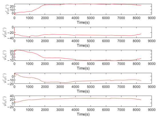 UKF estimate of phase errors between elements: (a) element 1 and element 2; (b) element 2 and element 3; (c) element 3 and element 4; (d) element 4 and element 5; (e) element 5 and element 1.