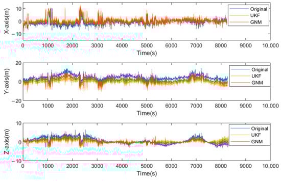 Due to the unknown true error values, direct visual assessment of calibration effectiveness is unfeasible. This study therefore employs comparative analysis of positional offsets between pre-/post-calibration results and ground truth locations as evaluation criteria. Figure 20 demonstrates the corrective effects of different calibration algorithms on target positioning, while Figure 21 compares positioning errors relative to ground truth before and after calibration. Table 6 further quantifies the RMSE derived from Figure 20 and Figure 21 for both uncalibrated and calibrated states. The results demonstrate that both calibration algorithms significantly enhance final positioning accuracy. Notably, UKF-calibrated errors yield lower RMSE values across all coordinate axes compared to GNM-calibrated results, confirming UKF’s superior corrective performance in practical data applications.