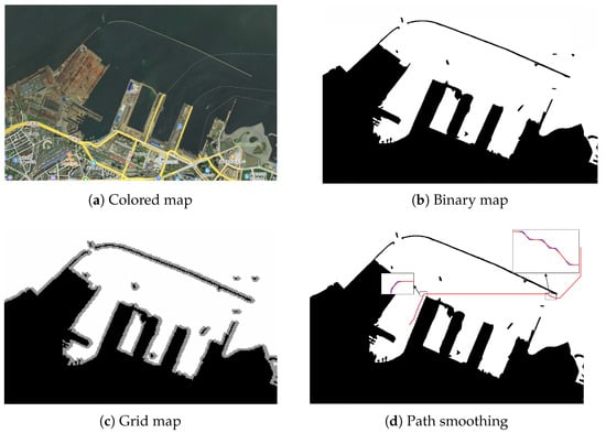 As a widely adopted spatial discretization technique, the grid method demonstrates exceptional efficacy in robotic path-planning applications. This approach is characterized by its straightforward data structure facilitating spatial analysis and surface modeling coupled with robust representational capacity. Nevertheless, its computational efficiency is compromised by substantial data storage requirements. The berthing system mitigates real-time constraints through the offline execution of grid mapping and global trajectory generation. The implementation workflow initiates with the acquisition of a 1:25,000 scale chromatic port chart from Google Maps (Figure 2a). Following grayscale conversion and binarization processes (Figure 2b), the spatial domain undergoes grid-based spatial decomposition. Critical obstacle boundaries are conservatively expanded by dual grid units to ensure collision-free navigation margins, as visualized in Figure 2c.