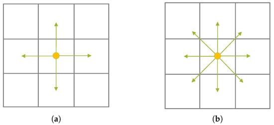 Schematic diagram of four-connectivity and eight-connectivity A* algorithms. (a) 4-connectivity A* algorithm. (b) 8-connectivity A* algorithm.