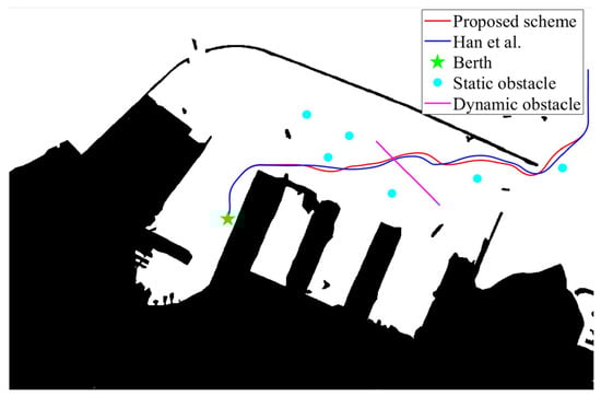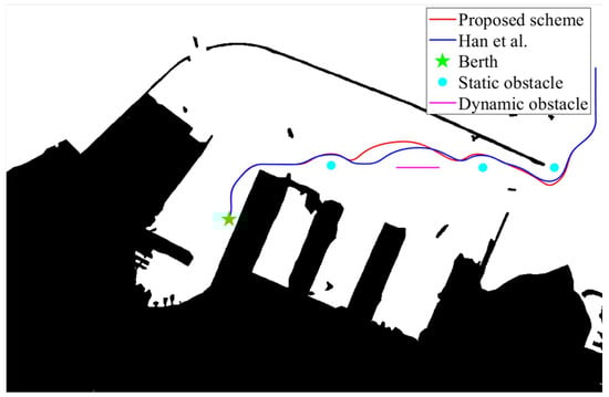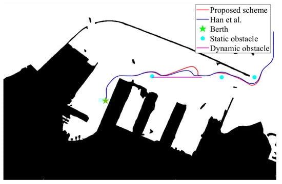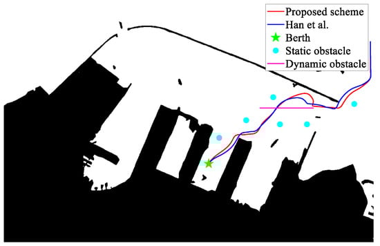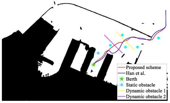 To evaluate the effectiveness of the proposed scheme, ref. []’s approach is employed in the experimental results. It is noted that [] proposed a trajectory tracking and collision avoidance scheme. Therefore, the focus of the simulation experiment is to compare the obstacle avoidance performance of the two schemes. Given the initial point (2.9, 27.2) and berth 1 (10.3, 10), berthing trajectories are generated according to the proposed scheme.
