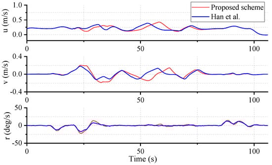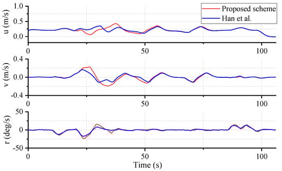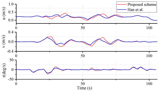 In order to predict the berthing motion under model uncertainty and disturbances, the standard three-degree-of-freedom (3-DOF) dynamics model of the ASV is applied []. In this model, only the surge, sway, and yaw motion are considered: