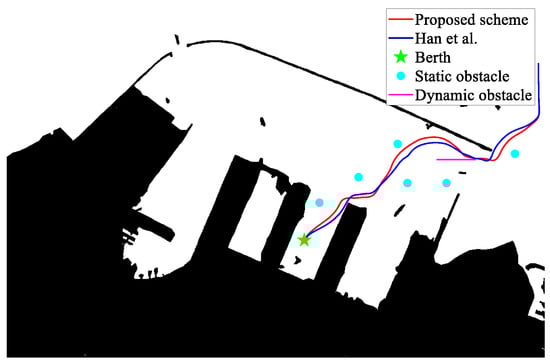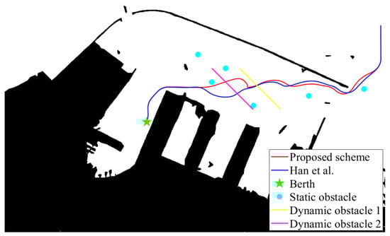In the complex scenario, the authors increased the number of obstacles and performed simulation experiments with different berths (berth 1 and berth 2). As a result, both schemes can avoid static and dynamic obstacles and reach the berth. According to Table 2, the proposed scheme exhibits superior berthing and obstacle avoidance performance compared to []’s method.