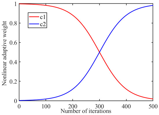 where is the -th individual of the -th iteration, is randomized spiral foraging, is optimal spiral foraging, and are nonlinear dynamic weighting coefficients, denotes the initial value of , denotes the final value of , denotes the initial value of , denotes the final value of , and are the current iteration number and the maximum iteration number, respectively, and , and are control parameters that control the rate of change in the weights, and different problems can try to select different combinations of and to obtain a better solution. The weight control parameter used in this paper is . The variation curve of nonlinear dynamic weights with the number of iterations is shown in Figure 3.