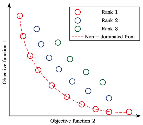 Fast non-dominated sorting [19] overcomes the shortcomings of excessive search iterations in conventional non-dominated sorting and reduces the computational complexity of the process, thereby decreasing the optimization algorithm’s complexity to .