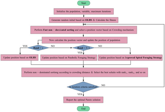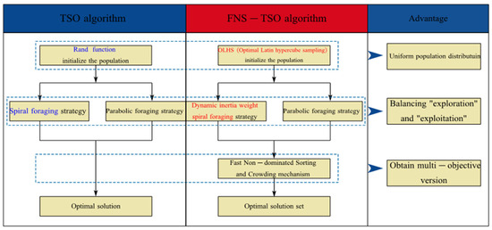 In summary, this paper proposes the following improvements to the TSO algorithm as shown in Figure 6: Optimized Latin Hypercubic Sampling (OLHS) replaces the random function for population initialization, enhancing population distribution uniformity; a dynamic weighting coefficient improves the spiral foraging strategy, further balancing the “exploration” and “exploitation” trade-off while enhancing algorithmic robustness; and incorporating the fast non-dominated sorting mechanism with the crowding distance mechanism lowers computational complexity and yields a multi-objective variant of the algorithm.