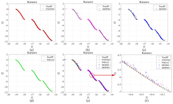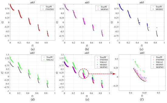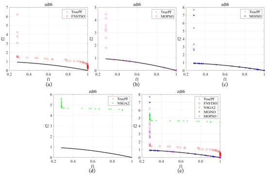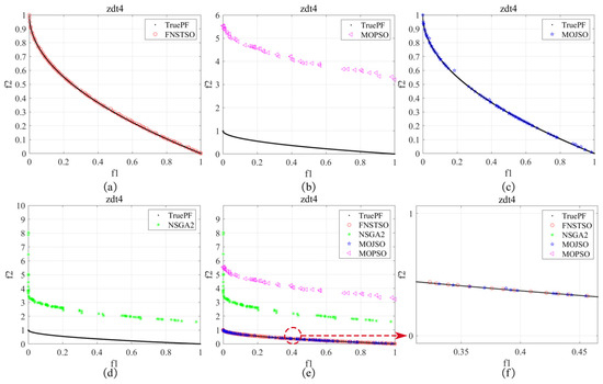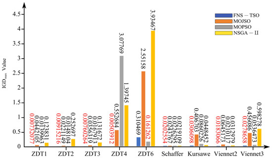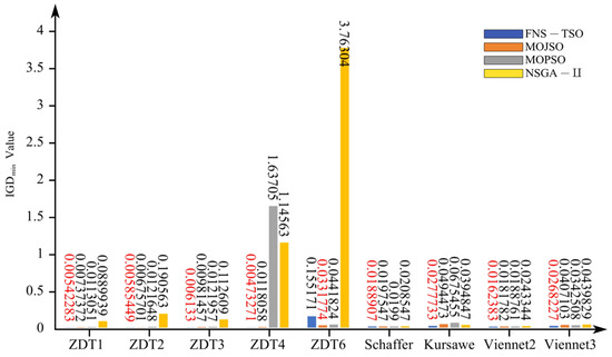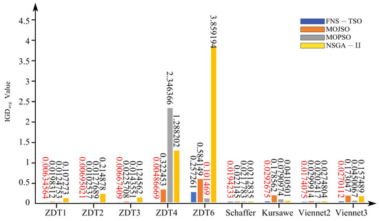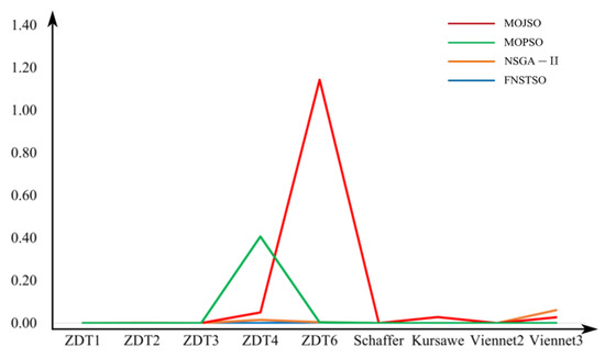 As shown in Figure 8, Figure 9 and Figure 10, the IGD metric of FNS-TSO achieves the lowest values on test functions ZDT1, ZDT2, ZDT3, ZDT4, Schaffer, Kursawe, Viennet2, and Viennet3, with average reductions of 49.13%, 32.22%, 53.51%, 98.49%, 8.74%, 28.70%, 14.00%, and 39.98% compared to the suboptimal algorithm. In ZDT6 test results, FNS-TSO’s average IGD value was higher than only MOPSO (2.54 times MOPSO’s average) but exhibited 55.96% and 93.33% lower IGD values than MOJSO and NSGA-II, respectively. MOPSO demonstrated superior performance in the ZDT6 test. These IGD comparisons indicate that FNS-TSO outperforms other algorithms in both convergence and diversity.