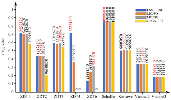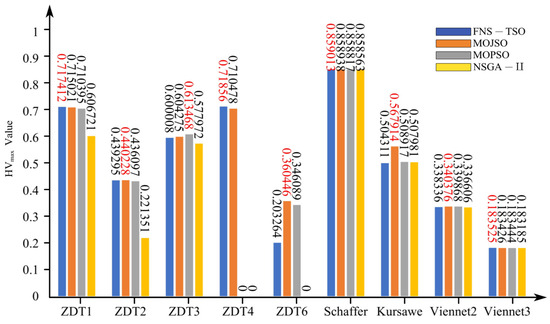 As shown in Figure 11, Figure 12 and Figure 13, FNS-TSO achieved the highest Hypervolume (HV) values on test functions ZDT1, ZDT4, and Schaffer, exceeding suboptimal results by factors of 1.0033, 1.0114, and 1.005, respectively. For minimum HV metrics, FNS-TSO demonstrated superiority on ZDT1, ZDT3, ZDT4, Schaffer, and Viennet3, outperforming suboptimal algorithms by 1.0110, 1.0131, 5.2603, 1.0006, and 1.0006 times, respectively. Regarding average HV performance, FNS-TSO attained optimal values on ZDT1, ZDT4, Schaffer, and Viennet3, surpassing suboptimal solutions by 1.0103, 1.9729, 1.0003, and 1.0005 times, respectively. Conversely, suboptimal performance was observed for ZDT2 and ZDT3, with HV values 0.36% and 0.123% lower than the optimal algorithm. These HV metric comparisons conclusively demonstrate FNS-TSO’s overall performance advantage over competing algorithms.