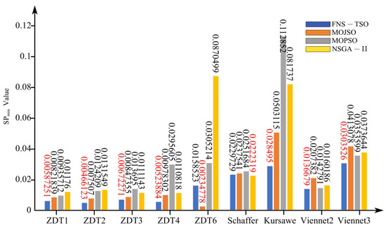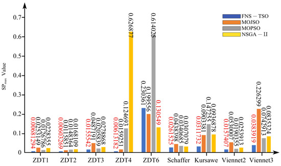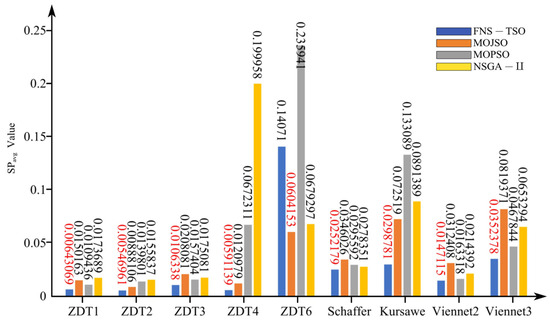 From Figure 14, Figure 15 and Figure 16, the data demonstrate that the SP metric of FNS-TSO achieves the lowest values on test functions ZDT1, ZDT2, ZDT3, ZDT4, Kursawe, Viennet2, and Viennet3, with average values 41.25%, 38.41%, 32.44%, 51.14%, 58.80%, 9.92%, and 24.68% lower than suboptimal algorithms, respectively. On the Schaffer test function, although FNS-TSO’s minimum SP value represents a suboptimal result (1.03× the optimal algorithm’s value), its average value remains superior, outperforming the suboptimal algorithm by 9.40%. These results indicate that FNS-TSO exhibits superior convergence across multiple benchmark functions. However, FNS-TSO underperformed in the ZDT6 test, exhibiting an average value 2.33× higher than the optimal algorithm, where MOJSO demonstrated the best performance. SP metric analysis confirms that FNS-TSO’s solution set demonstrates both enhanced uniformity and strong convergence characteristics.