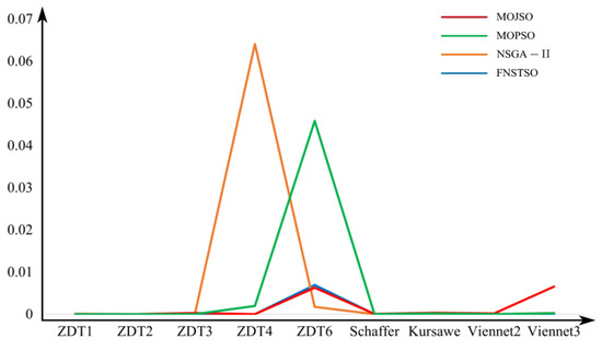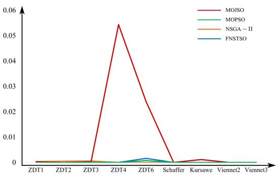 The performance test results of IDG, HV, and SP on ZDT-series test functions, including Schaffer, Kursawe, Viennet2, and Viennet3, are shown in Figure 8, Figure 9, Figure 10, Figure 11, Figure 12, Figure 13, Figure 14, Figure 15 and Figure 16. Among them, Figure 8, Figure 11 and Figure 14 show the maximum values of the evaluation metrics; Figure 9, Figure 12 and Figure 15 show the minimum values of the evaluation metrics; and Figure 10, Figure 13 and Figure 16 show the average values of the evaluation metrics.