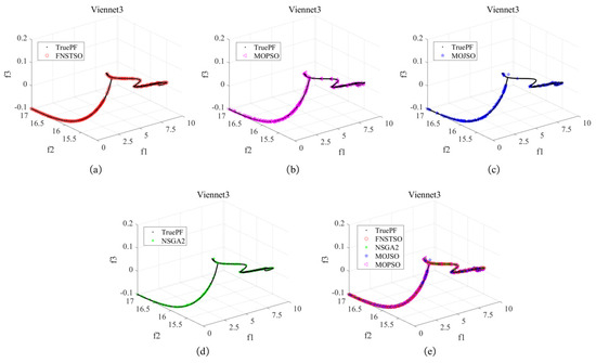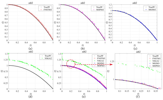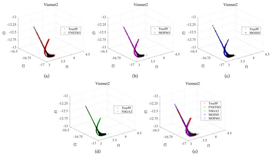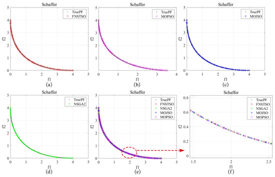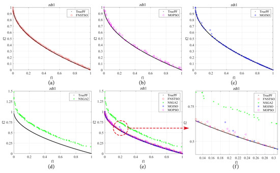 To validate the performance of the FNS-TSO algorithm, it was tested on nine different multi-objective functions, including seven 2-objective test functions (ZDT1, ZDT2, ZDT3, ZDT4, ZDT6, Schaffer, and Kursawe) and two 3-objective test functions (Viennet2 and Viennet3). Test functions such as the ZDT series, Schaffer function, and Viennet series are core tools for optimization algorithm validation due to their standardized design, diversity of challenge coverage (e.g., multimodal landscapes, non-convex fronts, conflicting objectives), and scalability. Algorithms such as MOPSO, NSGA-II, and MOJSO were also tested to analyze their performance in generating diverse Pareto fronts. See Appendix A.2 for details of the test functions.