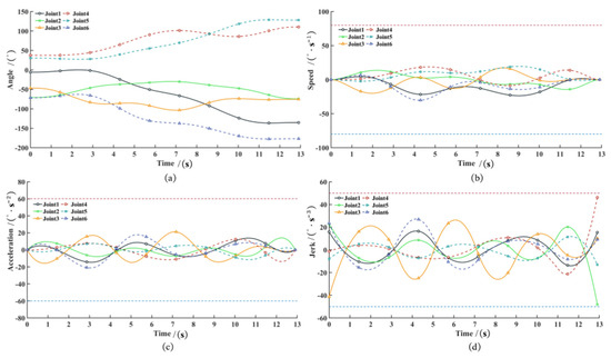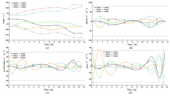 The variations in angle, angular velocity, angular acceleration, and jerk of the optimal quintic spline trajectories for each joint are shown in Figure 34.