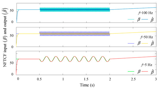 The tracking performance of the NFTCF output signal, which is tracked at different frequencies (f = 5 Hz, 50 Hz, 100 Hz) of the input β signal, is analyzed through simulations. The effect of the input signal β at different frequencies on the stability of the filter is investigated through these simulations. The parameters of Equation (3) are analyzed for their effect on the filter’s stability under the selected input signal β of the same frequency. The values of their best performance are selected. The results of these analyses can be found in Figure 4, Figure 5, Figure 6 and Figure 7.