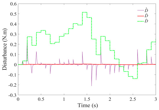 In the absence of consideration of the parameter-adaptive law design () and the disturbance estimation design () and taking into account in Equation (24), we obtain in Equation (26).