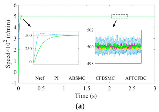As illustrated in Figure 17a,b, all four controller speeds demonstrate the capacity to be rapidly tracked to a specified reference speed input following a one-second loading period of 15 N·m and a two-second unloading period of 5 N·m. Moreover, the four controllers display a superior capacity to track the reference speed input in comparison to the PI control. In comparison to the PI control, the three controllers, ABSMC, CFBSMC, and AFTCFBC, demonstrate enhanced tracking capabilities to the reference input, both during loading and unloading. This is evidenced by the reduction in error and jitter control, coupled with the absence of oscillation following loading and unloading.
