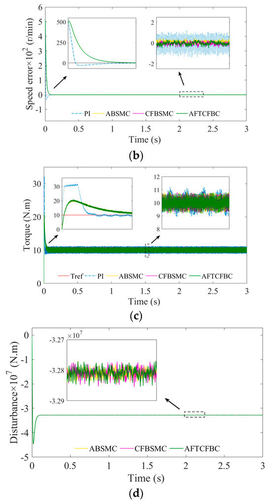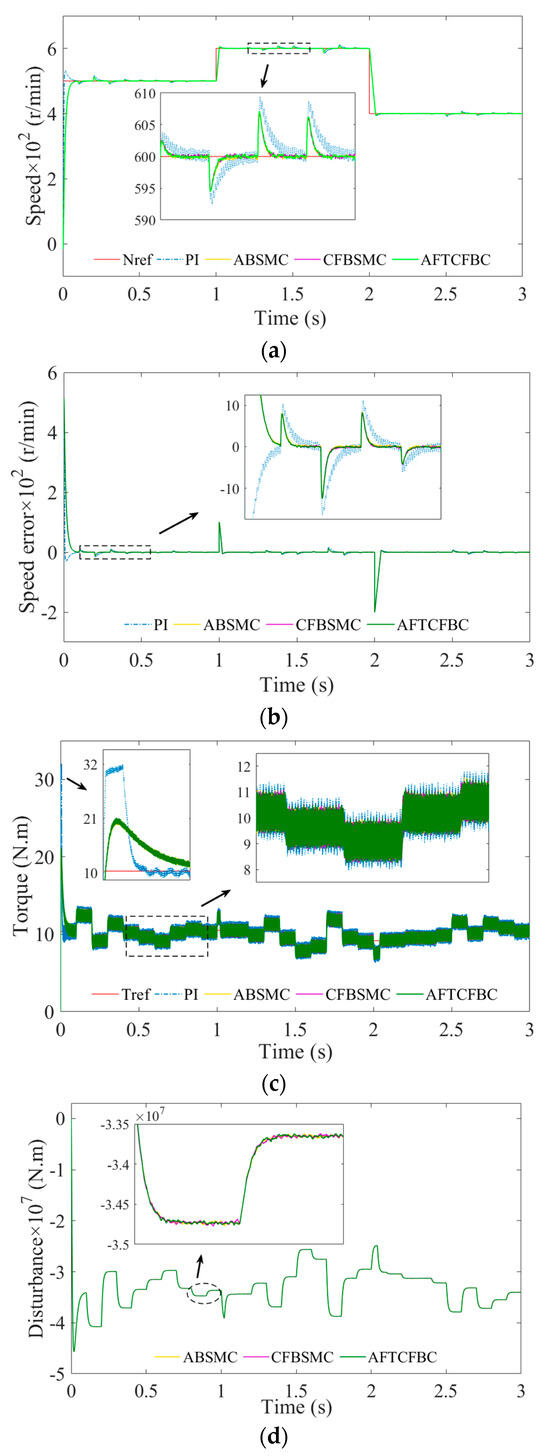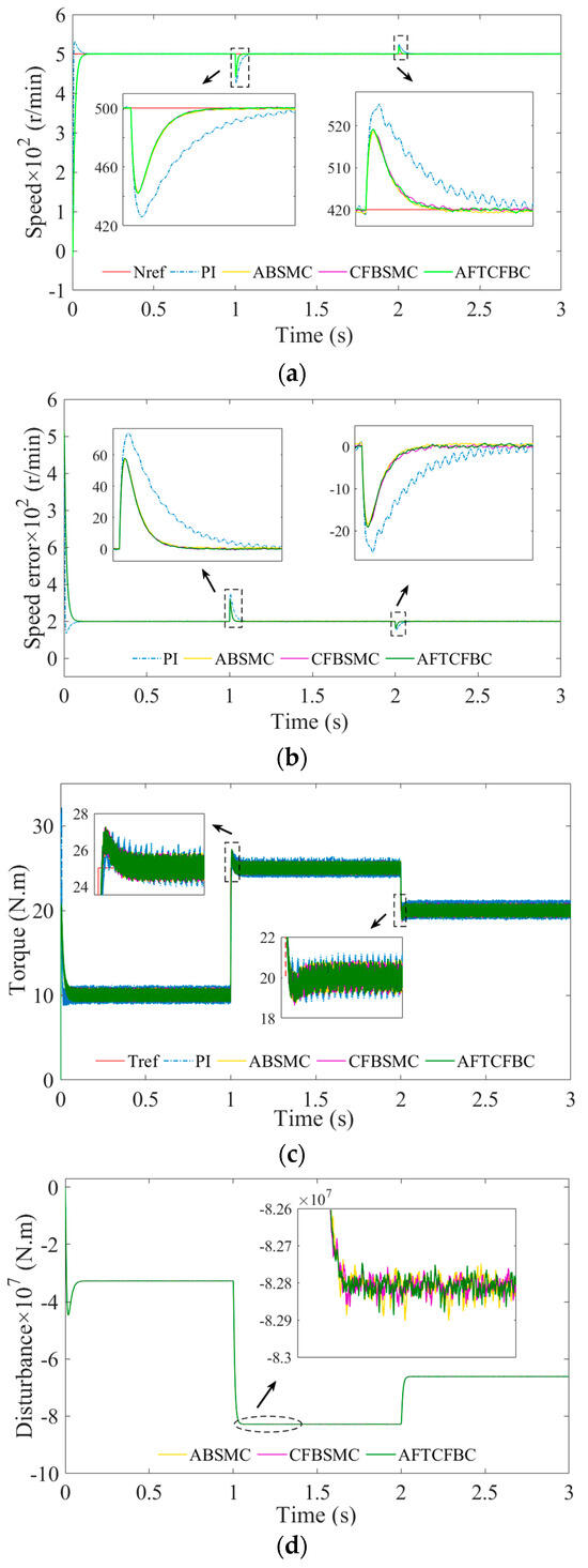 Figure 17c illustrates that the three controllers, ABSMC, CFBSMC, and AFTCFBC, demonstrate the rapid tracking of the desired value of the reference input torque following the loading or unloading of the motor. Their stability performance is superior to that of the PI control. In Figure 10d and Figure 17d, it can be observed that the disturbance estimation is more responsive to changes in torque than to changes in rotational speed. Furthermore, there is a positive correlation between the two variables in terms of numerical changes.