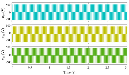 In the context of condition 1, characterized by constant speed and constant torque, the simulation study advances based on the control block diagram depicted in Figure 2. This approach enables the acquisition of the main state values of each component, including the SVPMW waveforms, three-phase voltages , the rotor position θ, the d-q-axis currents, and three-phase currents, of the PMSM with the AFTCFBC. The outcomes of this study are illustrated in Figure 11, Figure 12, Figure 13 and Figure 14.