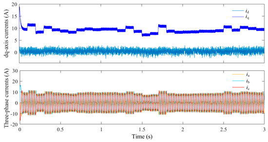 As evidenced by Figure 14, the dq-axis current waveform is stable, with exhibiting fluctuations at 0, while remains stable at approximately 10 A. Concurrently, the three-phase current is symmetrical and exhibits no substantial harmonics, thereby validating the efficacy of the AFTCFBC in achieving precise current control and ensuring the stability of motor torque output under operating condition 1. This outcome is pivotal in guaranteeing the efficient operation and reliable performance of the system.