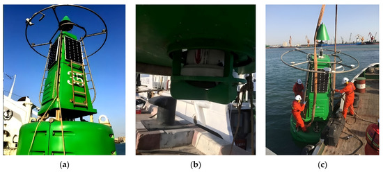 Photos from the field observations: (a) No. 35 working buoy and the micro-electro-mechanical system (MEMS)-based inertial motion unit installed on the top of it; (b) a stationary Acoustic Doppler Current Profiler (ADCP) mounted on the bottom of the buoy; (c) buoy launching.