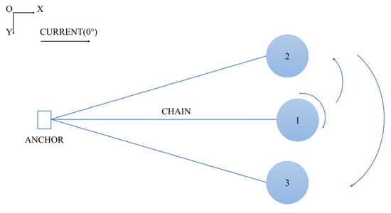 A schematic representation of this motion, as observed from an aerial perspective, is depicted in Figure 2. After the buoy drifts with the current to limit position 1, where the anchor chain tightens, it begins to move laterally from to position 2, then swings to position 3, and then returns to position 2, maintaining a stable oscillatory motion at a relatively consistent frequency. Viewed from above, this motion in question can be conceptualized as a pendulum, with the anchor point as the reference origin and the buoy acting as the pendulum’s bob. It moves along an arc-shaped trajectory on the water surface, with a radius equivalent to the projected length of the chain. Similar phenomena were occasionally observed in the laboratory model tests of the wave buoy, as documented by the authors of [2], but their research primarily examined the effect of the current on wave measurement.