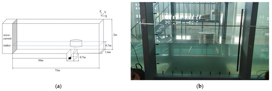 The experiments were conducted in a wave–current flume. As shown in Figure 4, the flume measures 75 m in length, 2 m in height, and 1.6 m in width. The working section is set 50 m from the wave–current maker, providing ample space for the flow to stabilize. A 0.7 m deep trench is constructed at the bottom of the working section to maximize the working water depth. The model of Buoy No. 35, used in field observations, was installed 50 m (streamwise) and 1 m (cross-flume) with a sinker. The water depth was maintained at 1.4 m for all test cases measured in the working section. It is important that the dimensions of the trench are well coordinated with the chain length, ensuring that the chain does not interact with the edges while the buoy is moving.