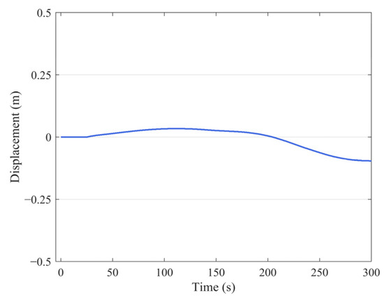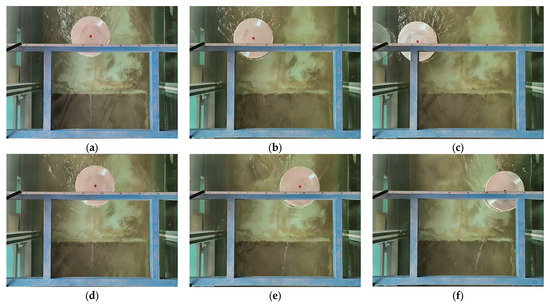 The experiment started once the cross-sectional velocity was confirmed to be stable under the test conditions by a velocimeter. Every oscillation experiment was carried out three times, with each condition being recorded for 300 s to obtain statistically average results. As expected, the buoy moved downstream to its limit position where the anchor chain was tightened. The chain projection length on the water surface is about 2 m. Subsequently, the displacement in the x-direction was found to be negligible, while the positional changes in the y-direction dramatically increased. The cylinder was constrained to move along an arc with a radius equivalent to the projected length of the anchor chain (2 m). As shown in Figure 6, all motion processes were captured by a high-speed camera. The time series data of the model’s displacements were presented after correcting for lens distortion. The commencement time was recorded from the moment the commands were transmitted to the current maker, which led to an initial phase of unstable current velocity. Therefore, only data subsequent to the 50 s mark were subjected to analysis.