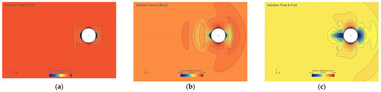 As can be seen from Figure 13a, a boundary layer occurs on the surface of the buoy at the initial time when fluid flows through it. The flow speed is faster on the upper and lower surfaces of the buoy, while it is slower on the front and rear surfaces. Figure 13b,c illustrates the transition process of a separated boundary layer, with some vortices gathered and attached to the back of the cylinder. According to Figure 13d, at time 6.86 s, a pair of counter-rotating vortices forms and attaches vertically upward and downward around the cylinder. Figure 13e shows that the vortex began to fall off at time 7.96 s. At time 8.4 s, the previously formed vortices have completely shed from the cylinder, forming new vortices (Figure 13f). As these vortices detach from one side of the buoy, a low-pressure area is formed on the opposite side. The uneven distribution of forces results in the buoy moving in the direction of the side where the vortex has recently separated. Subsequently, new vortices form and detach on the opposite side of the buoy. The vortices were built up and released from the body during the large sway accelerations when it moved in its wake. Figure 13g shows that after 16.1 s, vortices alternately shed from the trailing edge of the cylinder, developing into two parallel rows; that is, the vortex street behind the buoy began to form. At 24.16 s the vortex street was fully developed, and the shed vortices coalesced in the buoy’s wake (see Figure 13h), simultaneously exerting periodic forces.
