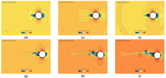 Velocity and scalar fields of the flow over time. (a) Initial flow development at t = 0.01 s; (b) Vortex formation at t = 2.66 s; (c) Vortex accumulation at t = 6.40 s; (d) Secondary vortex generation at t = 6.86 s; (e) Primary vortex detachment at t = 7.96 s; (f) Complete vortex shedding with new vortices at t = 8.4 s; (g) Vortex street with alternating shedding at t = 16.1 s; (h) Vortex pairing interaction at t = 24.16 s; (i) Flow field maturation at t = 29.56 s.