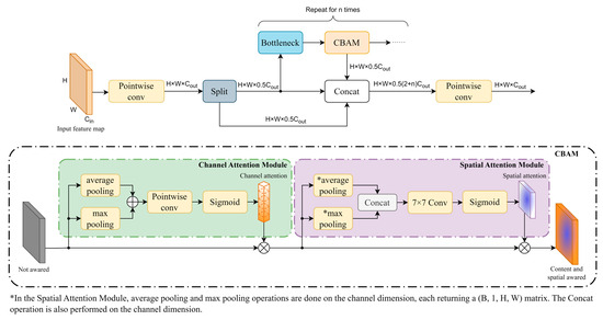 The Convolutional Block Attention Module (CBAM) is currently the most widely used convolution-based attention mechanism. We combined CBAM and C2f to construct the C2f_CBAM module, as shown in Figure 2. In CBAM, the incoming feature maps are first subjected to channel attention, and after obtaining the channel-attention matrix, element-wise multiplication is performed with the original feature maps so that the feature maps have channel attention. Subsequent spatial attention behaves similarly to channel attention, but average pooling and max pooling are changed to be performed in the height and width dimensions of the feature map, and pointwise convolution [31] is replaced with 7 × 7 Same convolution to generate a spatial attention matrix with a large receptive field. The CBAM is computed as follows: