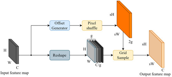 After obtaining the point offset, it is also necessary to perform a pixel shuffle operation to change the shape of the offset to . The grid sample operation [41] of the offset and input feature map is performed to obtain the final up-sampled feature map, which can be expressed as follows:
