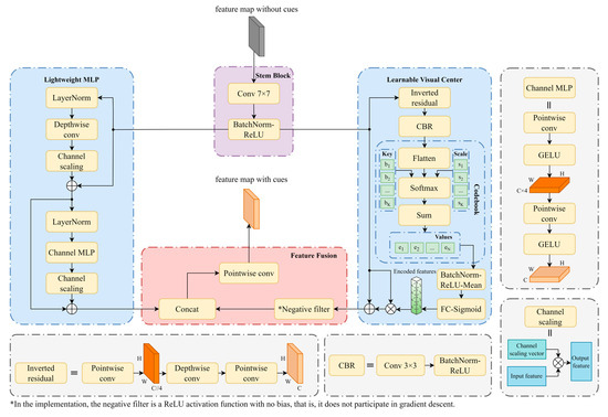 The feature map passed to the EVC is first feature-smoothed by the Stem module, i.e., a module consisting of 7 × 7 Same convolution, batch normalization [32], and ReLU activation function [32] to obtain the feature map . will be passed in parallel into the Lightweight Multi-Layer Perceptrons (LMLP) and the Learnable Visual Center (LVC) to obtain a global-dependence feature map and local corner region feature map. The output feature maps of these two submodules are concatenated and pointwise convolved in the channel dimension to obtain feature maps after integrating the two types of information, computed as follows: