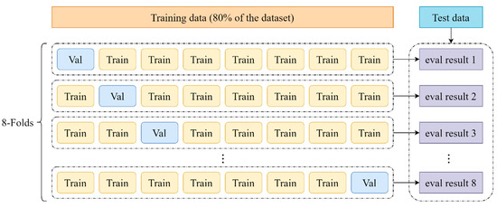 As shown in Figure 7, all the training data (including the training set and validation set mentioned in Section 3.1) are divided into eight folds. Once training starts, one of the folds is used as the validation set to evaluate the model during training, while the remaining folds are used as the training set in the training process. After training is completed, all models are evaluated on the testing set.
