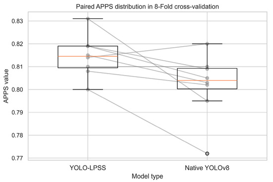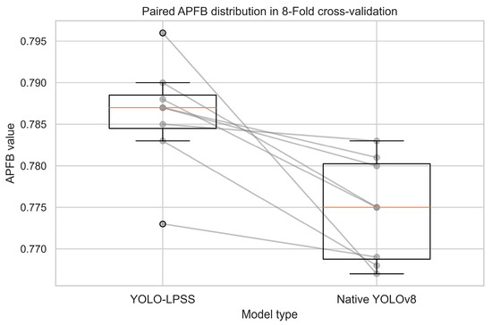 The training data from the same fold of the two models are paired, and the results are shown in Figure 8 and Figure 9, which show that the mean values of YOLO-LPSS are higher than the native YOLOv8 on both APFB and APPS.