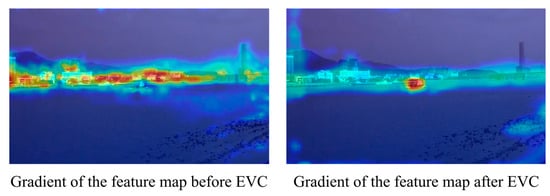 The EVC module has the highest computational demand among all the modules of the model, but the EVC does make the model “focus” on the small boat target. As shown in Figure 10, gradient-weighted class activation mapping (Grad-CAM) [50] is adopted to visualize the gradient of the feature maps before and after the EVC module, and it is obvious that the gradient of the feature maps after EVC processing is higher in the small boat region, i.e., the EVC successfully restores the small boat features lost in the previous feature maps. This raises the question: would reserving more channels for the output of the resample process help the EVC to better restore local area features? If so, how much additional computation would this change require?