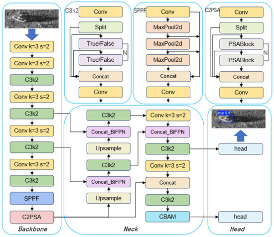 In our approach, the BiFPN structure is integrated into the Neck of the network to efficiently fuse multi-scale features. BiFPN achieves weighted fusion of multi-level features through top-down and bottom-up bidirectional pathways, significantly enhancing feature representation. Furthermore, this bidirectional multi-scale feature fusion enhances the network’s ability to detect targets of varying scales, particularly for small targets in complex scenarios.