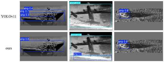 As shown in Figure 7, our method exhibits significant advantages in both detection accuracy and robustness. First, for ship target detection, YOLOv11 produces multiple overlapping bounding boxes in the first image, indicating challenges in handling targets within complex backgrounds. In contrast, our method accurately identifies the ship and provides a precise bounding box, demonstrating higher precision and robustness in processing such targets. Second, for aircraft target detection, while YOLOv11 successfully identifies the aircraft in the second image, the position and size of its bounding box are not entirely accurate, and it fails to detect the shipwreck, which could impact subsequent recognition tasks. Our method, however, accurately identifies both the aircraft and the shipwreck, providing precise bounding boxes, which highlights its superior accuracy and robustness in handling such targets.