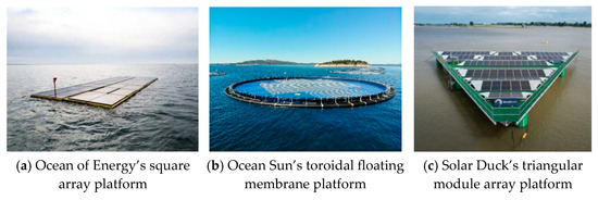 A typical FPV station covers a large sea area to increase power generation. It comprises photovoltaic modules, electronic equipment, brackets, floating bodies, and mooring lines. According to the shape of the floating body array, there may be three types of offshore FPVs [1]. The first is a floating array composed of multiple modular square float bodies. Each of the two modules are linked by connectors, which will make up the whole FPV station. Relative motions may happen between modules. The Zon op Zee [4] project about the multiple modular FPV has been developed by the Ocean of Energy in the North Sea near the Netherlands, as shown in Figure 1a. The connectors between the modules are hinged. However, it should be noted that for large floating bodies, the relative motion of this connection will induce complicated loads, leading to strength damage in the connection parts [5]. The second is a toroidal floating body composed of a circular cross-sectional floating body. The buoyancy ring is tightened by a high-strength flexible film made of special materials resistant to the marine environment. The photovoltaic panel is installed on the film, so the entire system can move with the waves.