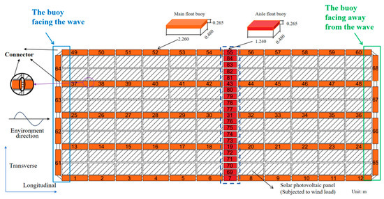 One type of multi-buoy offshore FPV array, shown in Figure 3, is introduced to investigate the hydrodynamics. The system is composed of 84 buoys connected to each other using connectors. Solar photovoltaic panels are fixed on the buoys. Due to the buoy’s small size, it is assumed to be a rigid body in the FPV array, ignoring any flexible deformation.