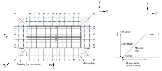 Multi-point mooring placed on different buoys is used to fix the offshore FPV array with 40 mooring lines. One end of the mooring line is connected to the buoy in the main buoy of the square array, and the other is connected to the anchor point. The mooring lines are evenly and symmetrically distributed around the FPV array, with four lines arranged in the corners, as shown in Figure 4. The mooring lines’ stiffness are shown in Table 3.