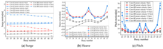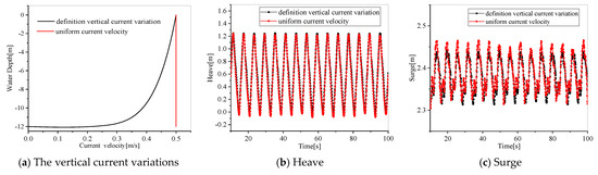 Currents often occur in open seas. Currents on the surface of the ocean are mainly caused by winds, the changes in pressure, and tides acting on the sea surface. Under the condition of a large tidal range, the currents caused by the rise and fall of the tides are usually 0.01–1 m/s, and can even reach more than 2 m/s in special sea areas. A complex flow field with a time-varying velocity direction can be formed with other currents. In the natural environment, it is mostly an unsteady flow. For example, in the process of tidal fluctuation, the seawater flow rate, water depth, and bottom friction velocity change with time, and this change is not synchronized. However, in this study, the draft of the buoy is only 0.11 m, which is relatively shallow. It is mainly affected by the surface flow of the sea surface. Therefore, the current velocity of the sea surface is the main concern. The current below the water surface mainly affects the mooring of the FPV array. The uniform currents are set in this paper, as the current velocity changed in the vertical profile. Comparing the motion response of the buoy under different vertical current variations, the difference is small, as shown in Figure 6. Therefore, in order to simplify this study, it is treated as a steady flow.